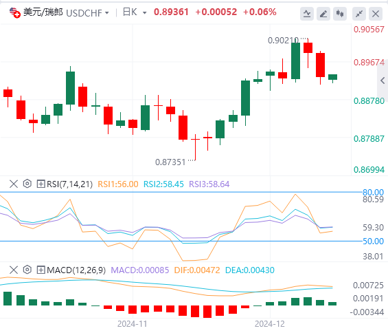 美联储上周将利率下调了四分之一个点,并预计2025年仅会降息两次,低于原先预测的四次。美国央行发出的鹰派信号似乎对未来几个月持续的通货膨胀感到新的担忧,这可能会提升美元兑瑞郎(CHF)的汇率。
