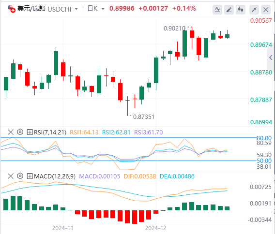 美元/瑞郎面临阻力,因为瑞士法郎在瑞士GDP数据发布后走强,数据显示经济增长强于预期,第三季度同比加速。然而,瑞士央行行长MartinSchlegel最近的言论暗示瑞士利率可能会跌至零以下,这仍然在交易员的脑海中。