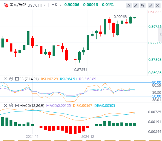 美国通胀高企以及对当选总统唐纳德·特朗普政策可能助长通胀的担忧,美联储(Fed)暗示,它可能会在2025年比9月份预测的更缓慢地降息。美联储官员预计明年将降息两次,低于三个月前预测的四次降息。市场对美联储(Fed)明年在2025年减少降息的预期越来越高,这可能会支撑美元兑瑞士法郎。