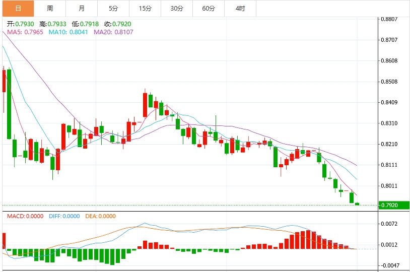 分析认为目前上方初步阻力位关注0.8080(前期整理平台),若无法快速收复,将难以缓解下行压力。下方短期支撑关注0.7956一线,若失守恐进一步下看0.7900甚至0.7800区域。
