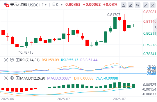 尽管瑞士通胀数据强于预期,但周一仍出现下降,7月份消费者价格指数(CPI)同比上涨0.2%,高于预期的0.1%,而月度通胀率持平于0.0%,超出预期的-0.2%下降。截至撰写本文时,美元/瑞郎在美国交易时段徘徊在0.8078附近,当日上涨近0.50%。