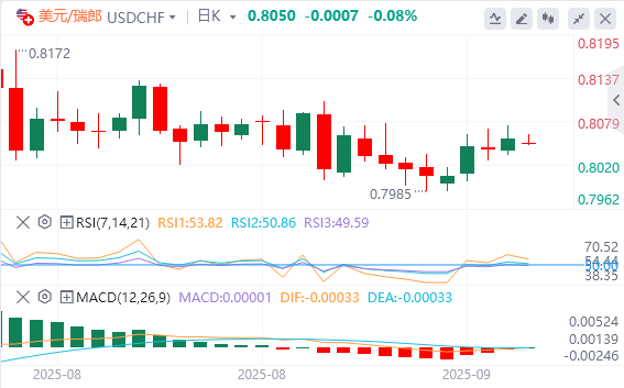 美元/瑞郎稳定在50日简单移动平均线(SMA)0.8051附近,连续第四天在0.8050-0.8100附近盘整。