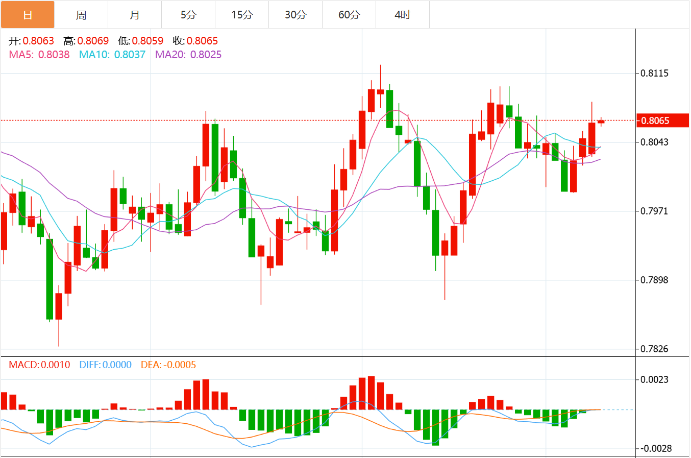 技术上,汇价在近两个月内呈现明显的宽幅震荡格局,上方0.8123和0.8101构成双重阻力结构,下方0.7872和0.7877形成双底支撑区域。当前价位正好处于0.8000整数心理关口上方,该位置具有重要的技术意义。从K线形态观察,汇价自触及0.8123高点后持续回落,期间虽有反弹但始终未能有效突破前高。近期汇价在0.8000至0.8050区间内反复拉锯,显示多空双方在此区域激烈博弈。若汇价有效跌破0.8000,下方首要支撑将指向0.79水平线位置;反之若能重新站稳0.8050上方,则有望向0.8100区域发起挑战。