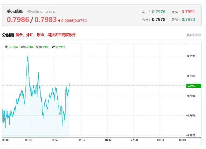 7月17日,周四欧市盘中,尽管周四公布的瑞士贸易差额有所改善,但美元/瑞郎仍上涨约0.50%,在欧洲时段交易于0.8040附近。瑞士6月份的贸易顺差扩大至43亿瑞士法郎,比5月份的22亿瑞士法郎几乎翻了一番。出口环比增长8.6%至230亿瑞士法郎,而进口下降1.5%至187亿瑞士法郎。 交易员预计,在最近的瑞士6月通胀报告发布后,