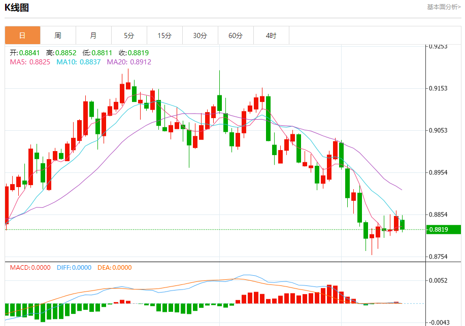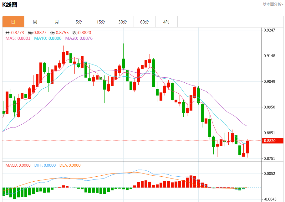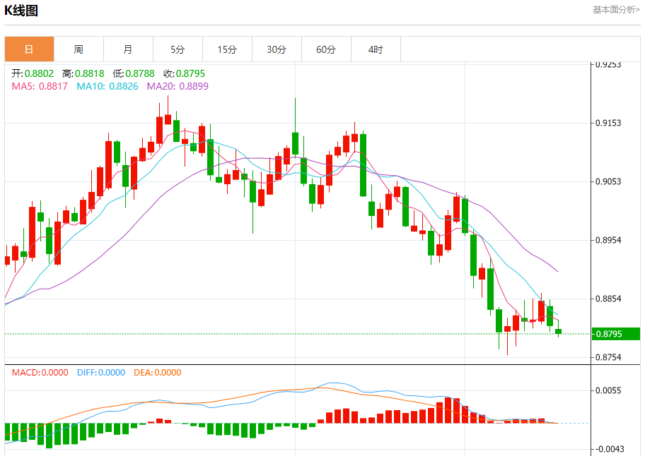 美元兑瑞郎今日汇率最高0.8771,最低0.8711,涨跌0.0006,涨跌幅0.07%。 市场基本面分析 路透社调查显示,多数经济学家预计瑞士央行会把主要政策利率降至0.25%,且在未来较长时段维持该水平。此前,市场曾猜测瑞士央行可能大幅降息至零甚至负值。然而,近期全球金融环境不确定性加剧,瑞士央行或倾向更保