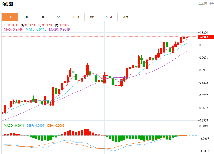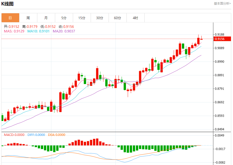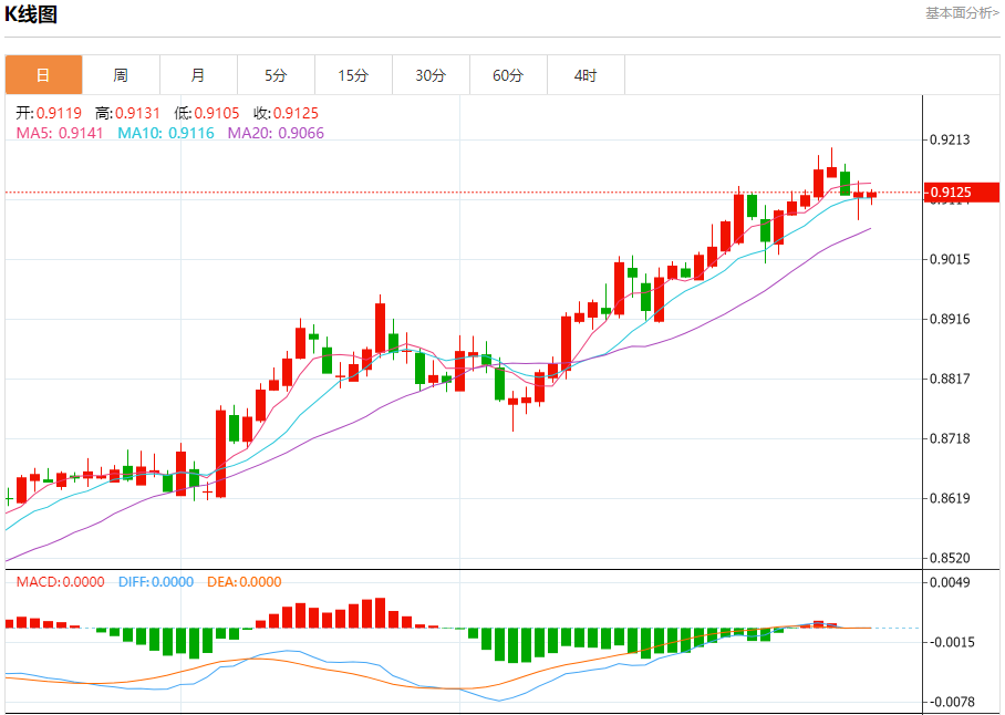 美元兑瑞郎今日汇率最高0.9121,最低0.9121,涨跌-0.0001,涨跌幅-0.01%。 市场基本面分析 美银策略师称因预计瑞士央行将继续放松货币政策而美联储不予降息,美元兑瑞郎势将扩大涨势,预计三个月内美元/瑞郎触及0.9450,因瑞郎“尚未被低估”,且在贸易不确定性、增长强劲和政策分化背景下,所有道路都通