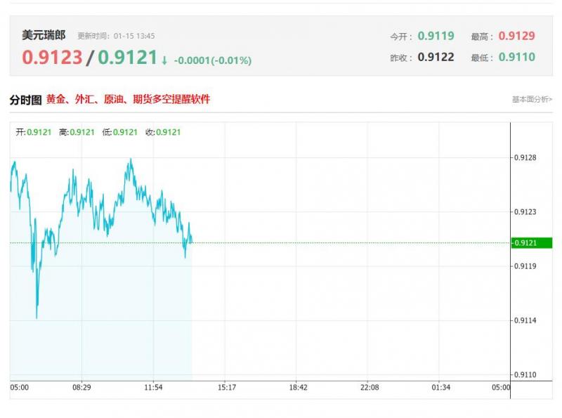 1月15日,周三欧市初盘,美元/瑞郎在0.9120附近呈温和负面偏向交易。市场可能在周三公布的美国12月消费者物价指数(CI)通胀数据之前变得谨慎。 周二公布的美国生产者价格指数(I)低于预期,打压了美元兑瑞士法郎(CHF)。注意力将转向周三晚些时候公布的美国12月CI通胀数据。分析师表示,通胀报告对美元的影响可能是