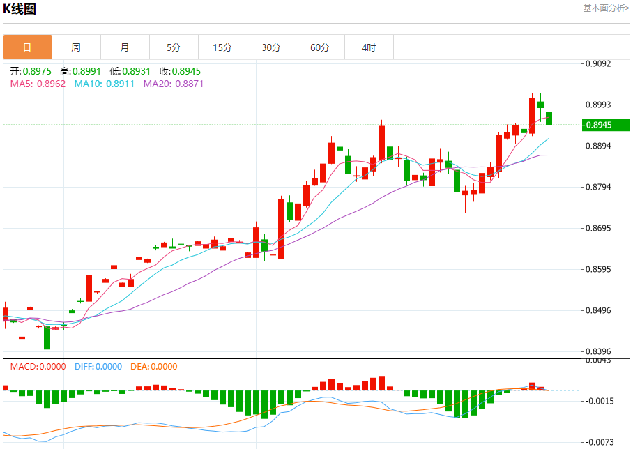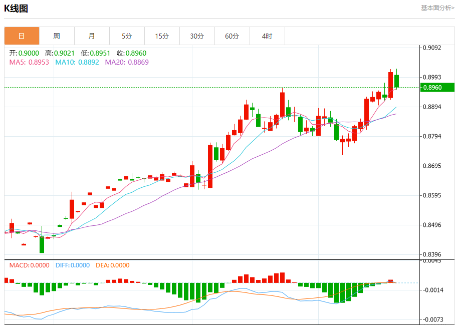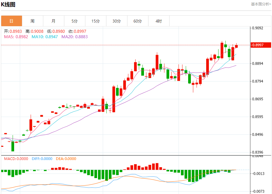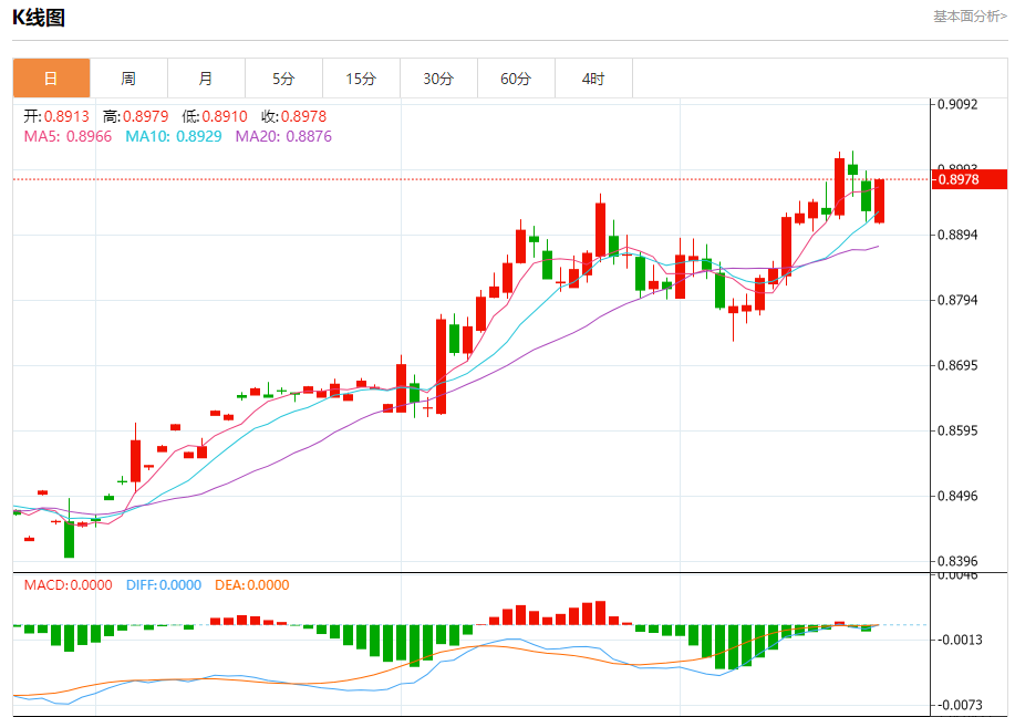 美元兑瑞郎今日汇率最高0.9021,最低0.8994,涨跌-0.0014,涨跌幅-0.16%。 市场基本面分析 市场普遍预计瑞典央行将降息多达50个基点,美元周三上涨,触及两年来的最高水平108.260,此前美联储一如普遍预期宣布降息,同时暗示将放缓货币政策宽松周期的步伐。 美元兑瑞郎走势预测 美元兑瑞郎
