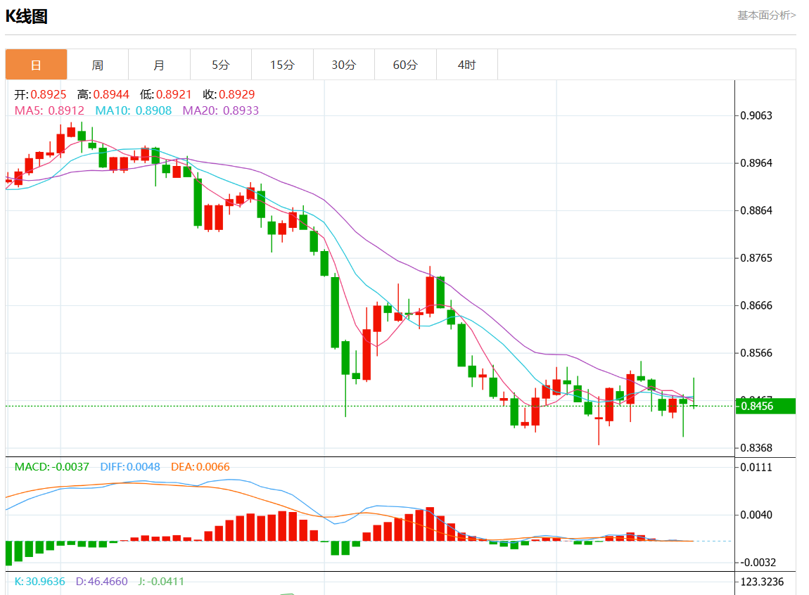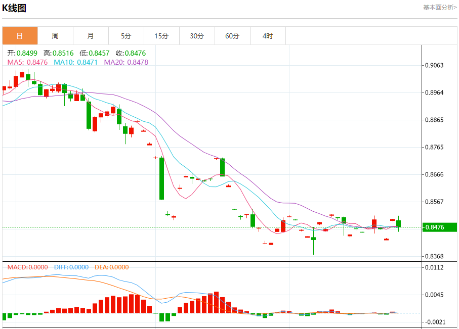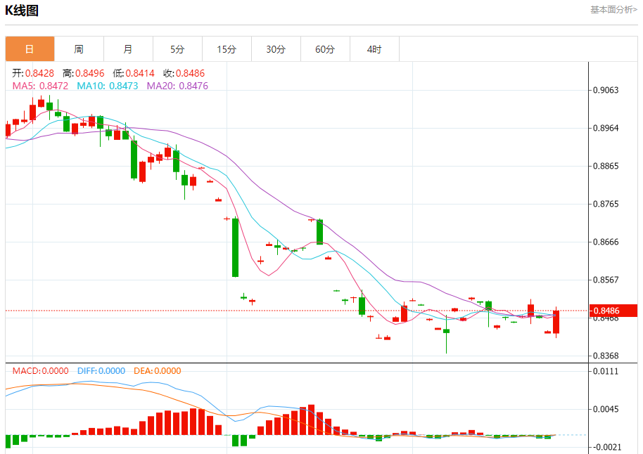 周四盘中,美元/瑞元报0.8466,跌幅0.40% 今日分析:在0.8480之上,看涨,目标价位为0.8520,然后为0.8545。 技术点评:即使我们不能排除持续调整的可能性,其时间长度上,应该是有限的。 支撑位:0.85600.85450.8520 阻力位:0.84800.84600.8445 (亚汇网编辑:静香)