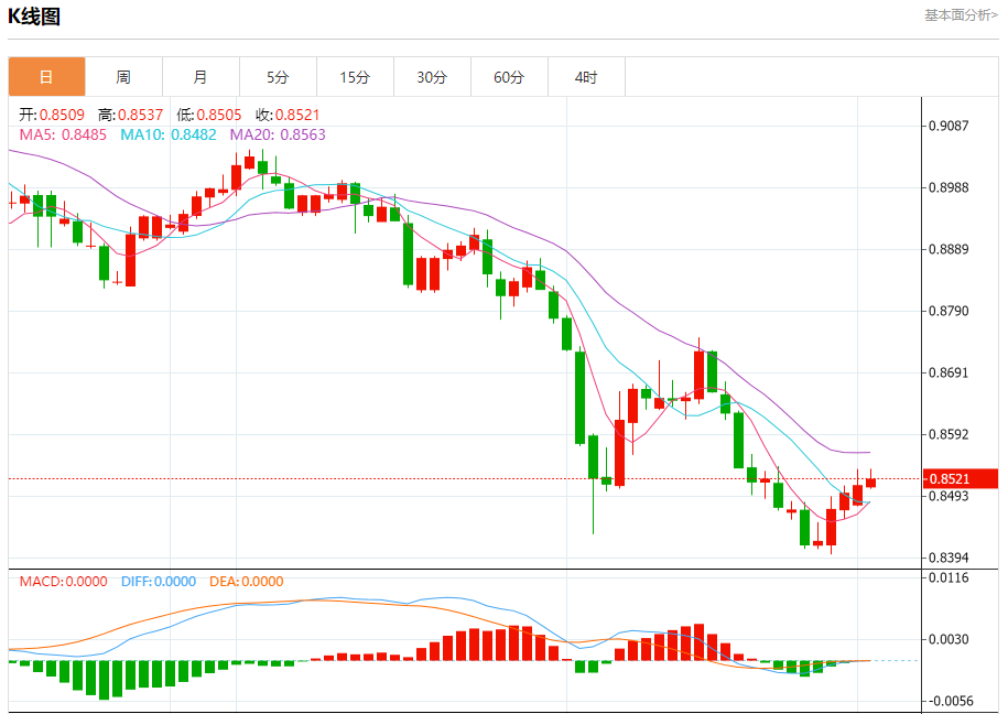 周四盘中,美元/瑞元报0.84698,涨幅0.05%. 今日分析:在0.8480之下,看跌,目标价位为0.8445,然后为0.8430。 技术点评:上升的空间可能被0.8480阻力位所限制。 支撑位:0.85150.84950.8480 阻力位:0.84450.84300.8415 (亚汇网编辑:静香)