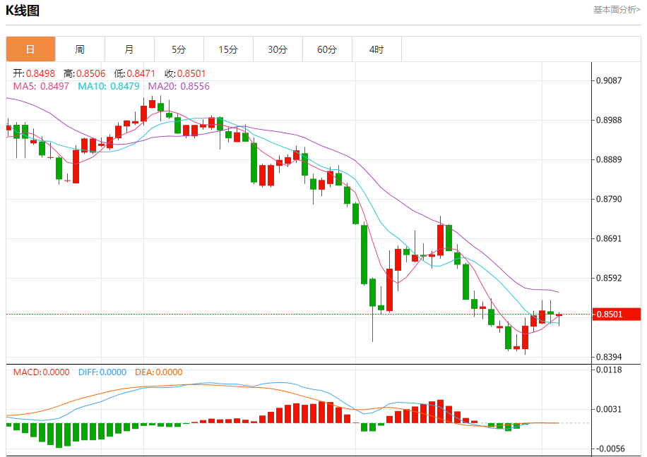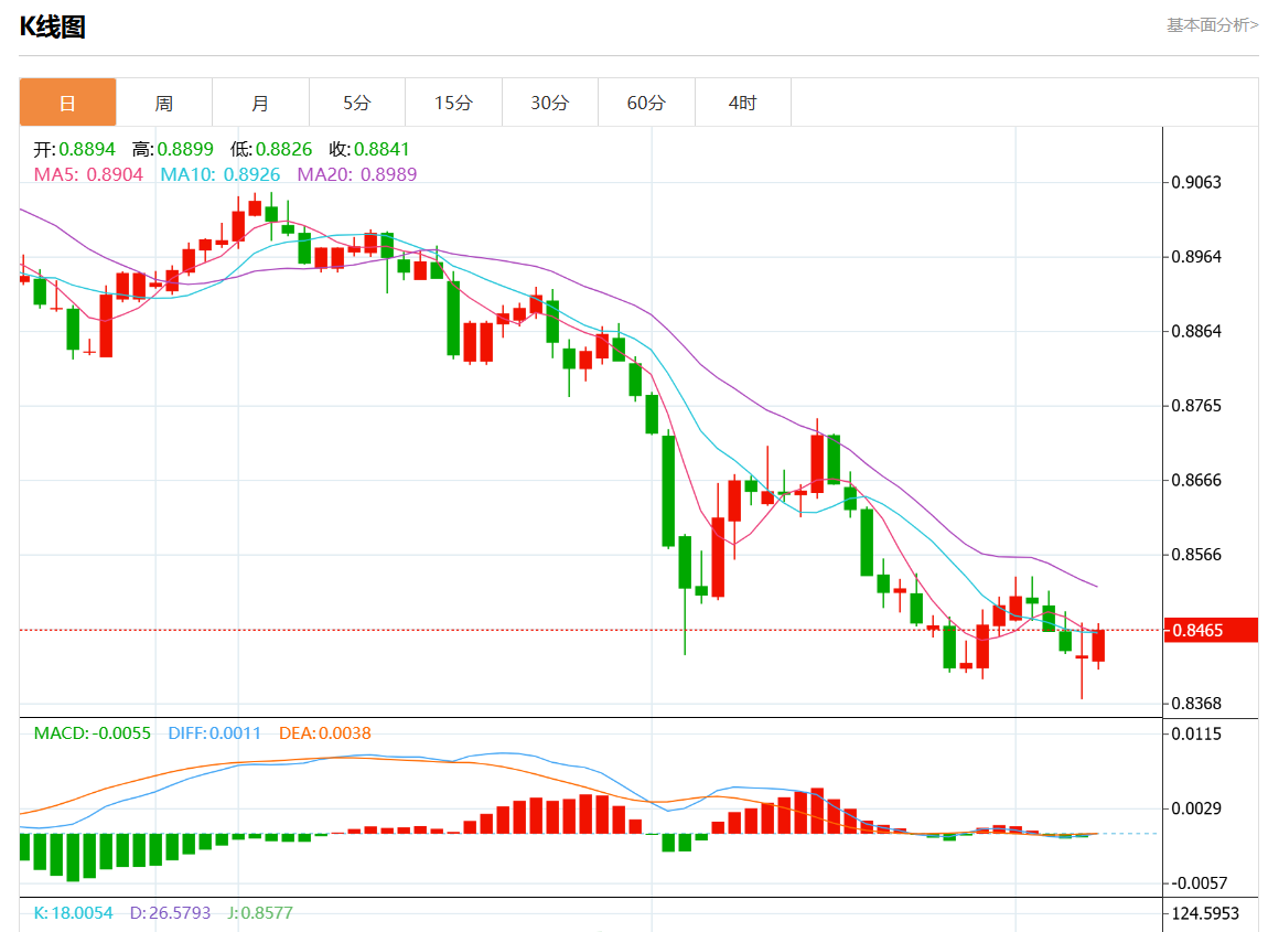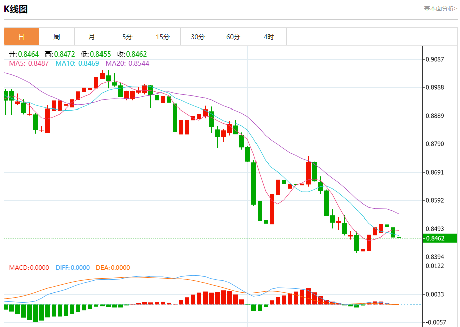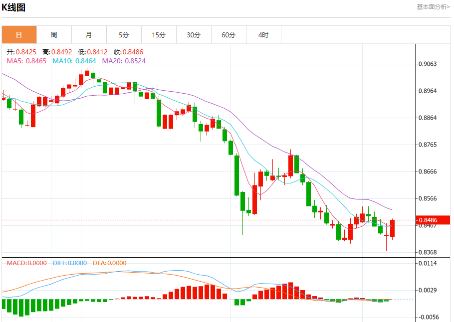 周五盘中,美元/瑞元报0.8412,跌幅0.32%. 今日分析:在0.8450之下,看跌,目标价位为0.8400,然后为0.8380。 技术点评:RI技术指标上,呈现下跌趋势。 支撑位:0.84900.84700.8450 阻力位:0.84000.83800.8360 (亚汇网编辑:静香)