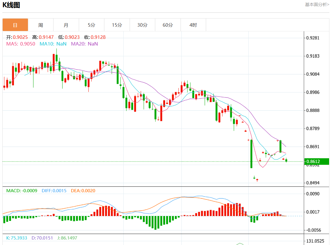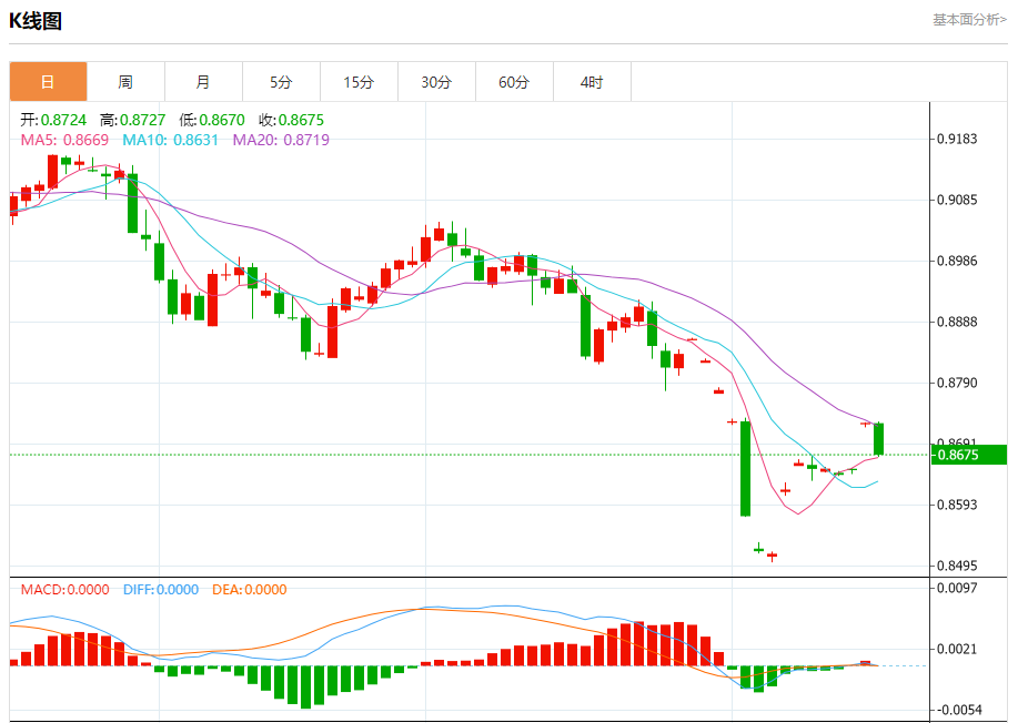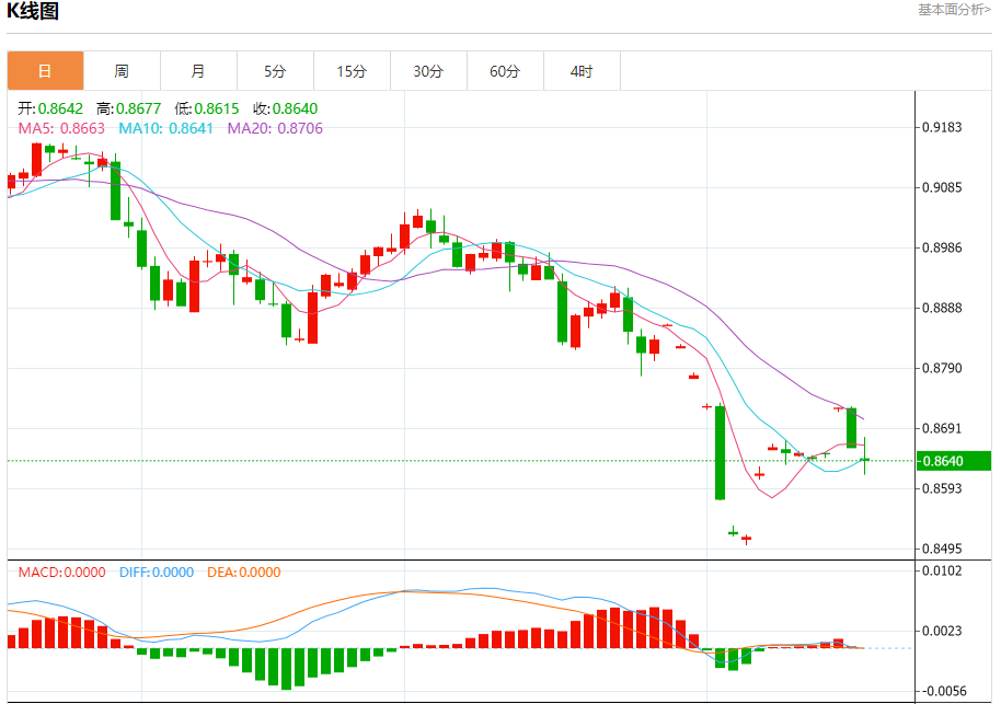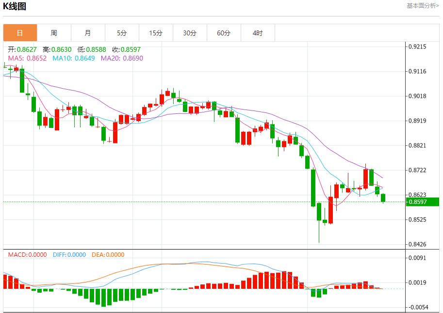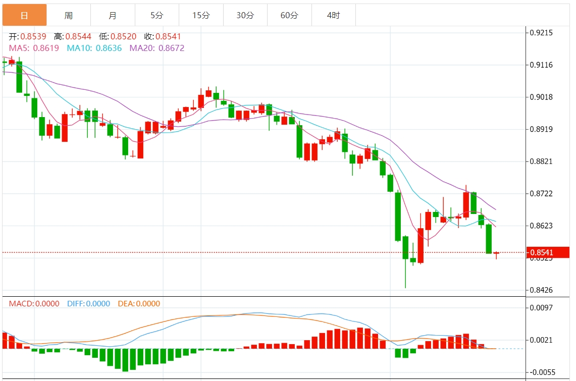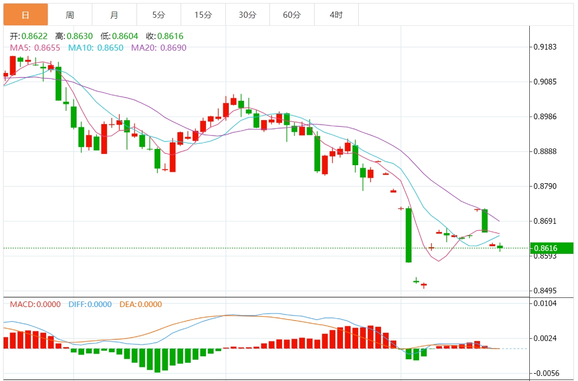 周二盘中,美元/瑞元报0.8610,跌幅0.19%. 今日分析:在0.8640之下,看跌,目标价位为0.8600,然后为0.8580。 技术点评:只要0.8640阻力位不被突破,向下跌破0.8600位置的风险很高。 支撑位:0.86750.86550.8640 阻力位:0.86000.85800.8560 (亚汇网编辑:静香)