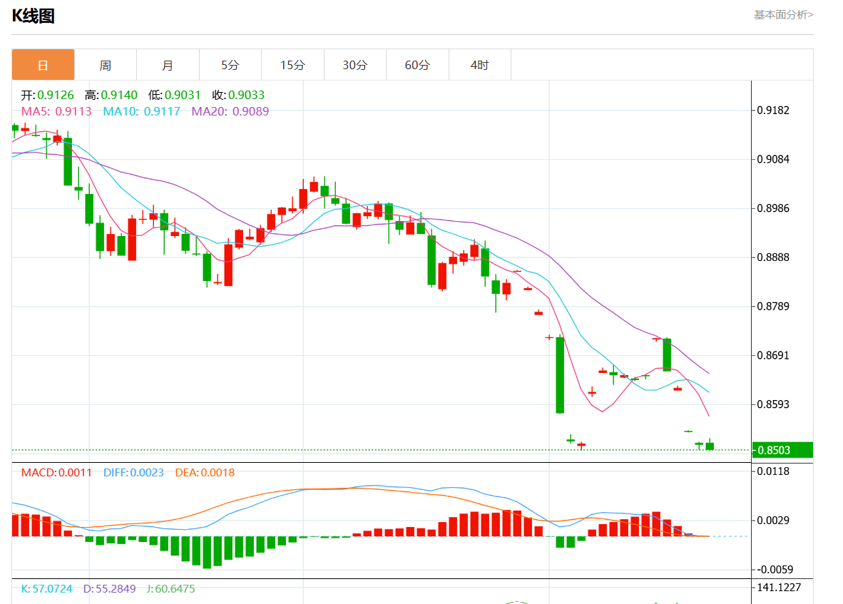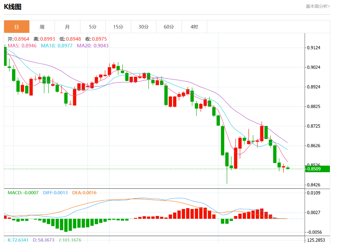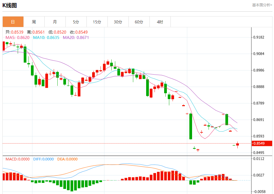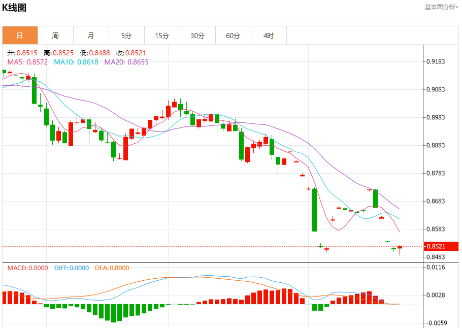 周四盘中,美元/瑞元报0.8494,涨幅0.28%. 今日分析:在0.8540之下,看跌,目标价位为0.8490,然后为0.8470。 技术点评:跌破0.8490位置,将会引发下跌至0.8470。 支撑位:0.85800.85600.8540 阻力位:0.84900.84700.8440 (亚汇网编辑:静香)