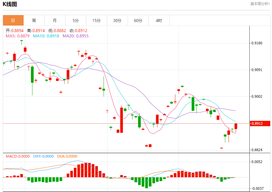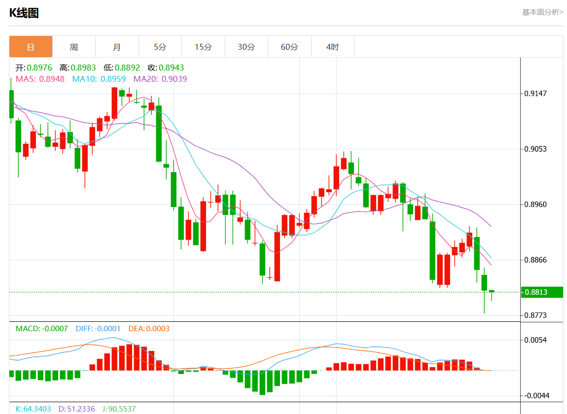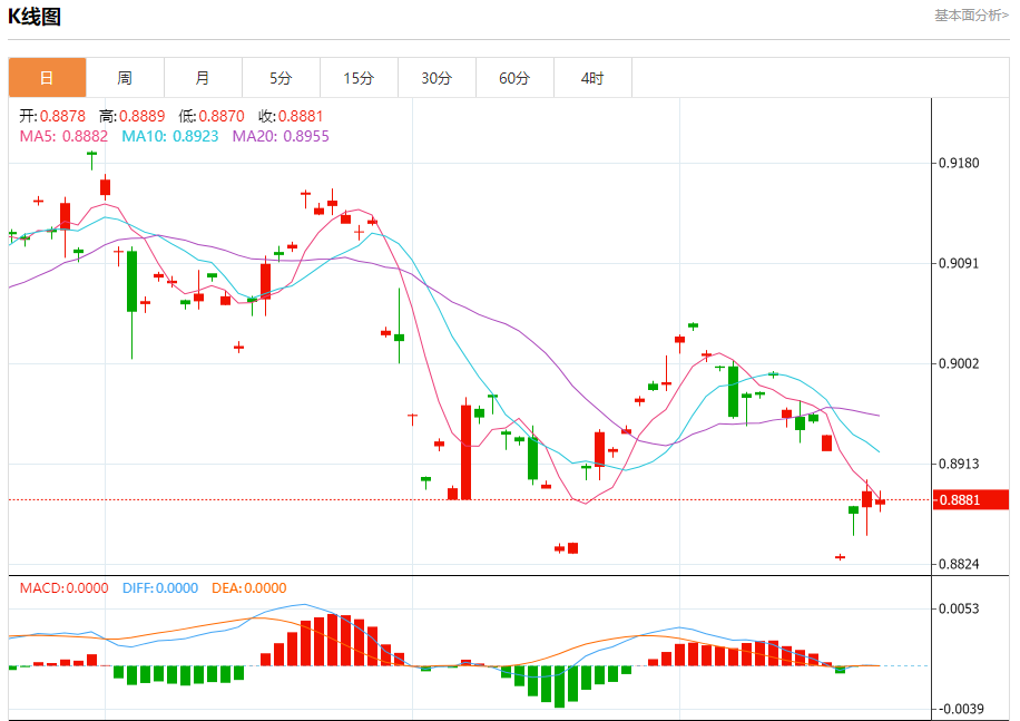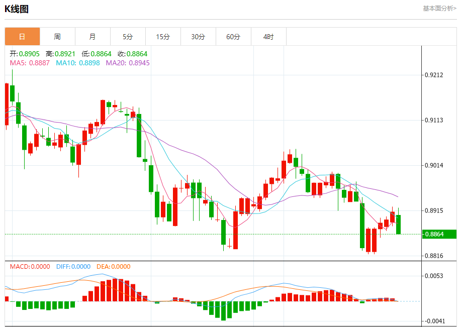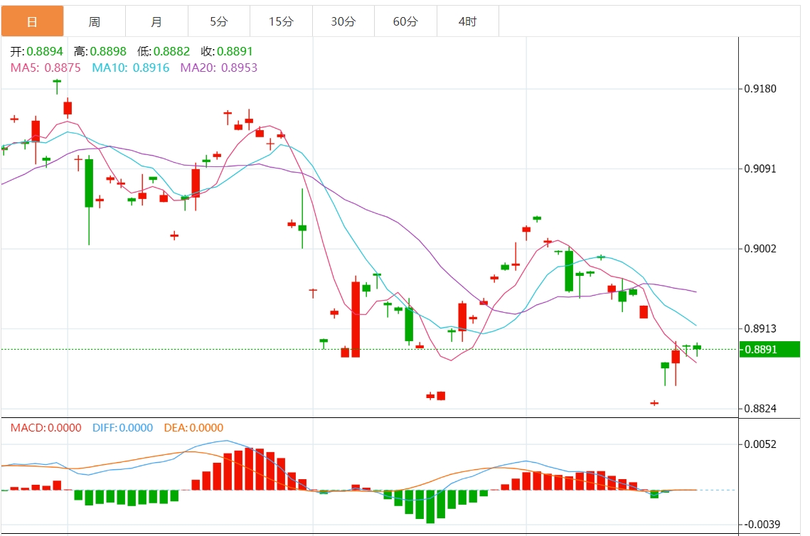 周三盘中,美元/瑞元报0.8901,跌幅0.08%. 今日分析:在0.8900之上,看涨,目标价位为0.8925,然后为0.8940。 技术点评:超短线(当日内)技术指标运行趋势复杂,应谨慎操作。 支撑位:0.89550.89400.8925 阻力位:0.89000.88850.8870 (亚汇网编辑:静香)
