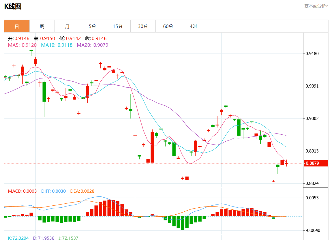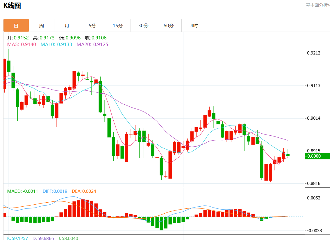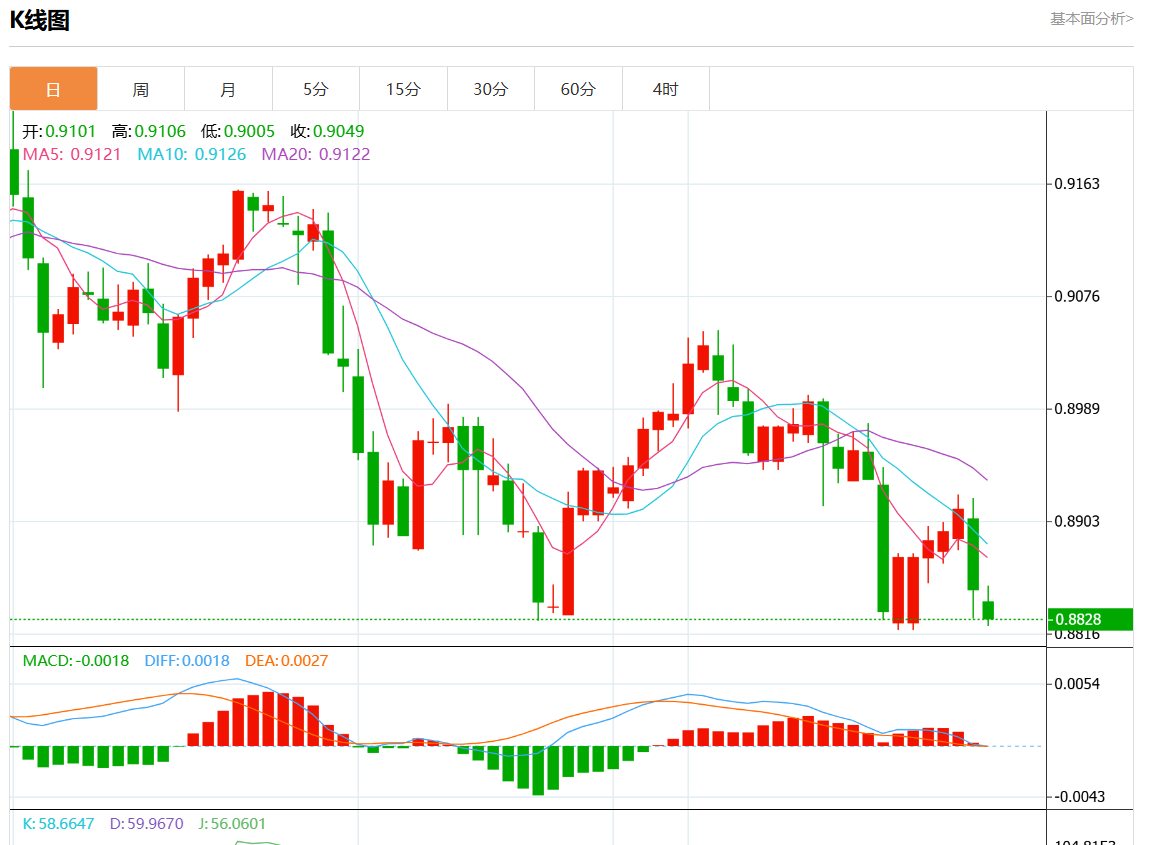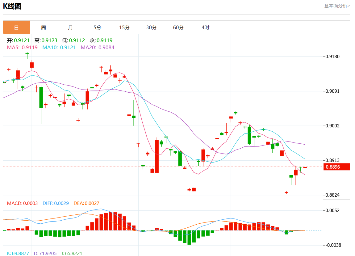 周三盘中,美元/瑞元报0.8901,跌幅0.08%. 今日分析:在0.8900之上,看涨,目标价位为0.8925,然后为0.8940。 技术点评:超短线(当日内)技术指标运行趋势复杂,应谨慎操作。 支撑位:0.89550.89400.8925 阻力位:0.89000.88850.8870 (亚汇网编辑:静香)