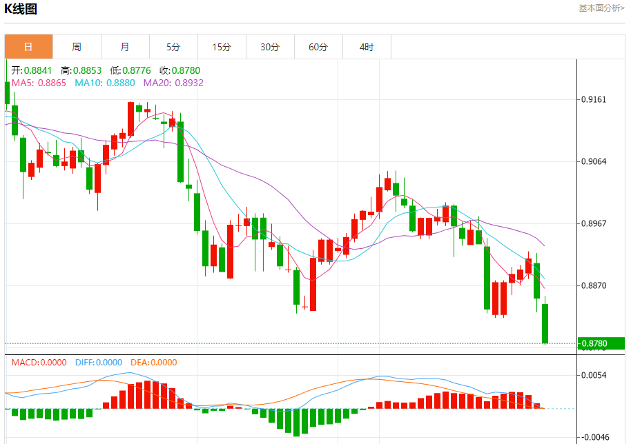 周四盘中,美元/瑞元报0.8827,跌幅0.27%. 今日分析:在0.8860之下,看跌,目标价位为0.8805,然后为0.8790。 技术点评:只要0.8860阻力位不被突破,向下跌破0.8805位置的风险很高。 支撑位:0.88900.88750.8860 阻力位:0.88050.87900.8775 (亚汇网编辑:静香)