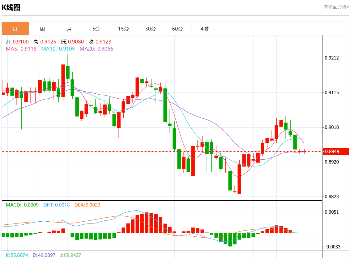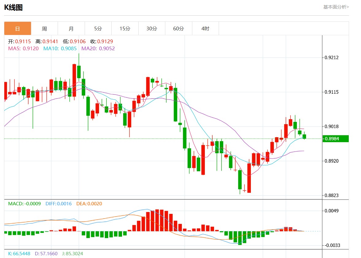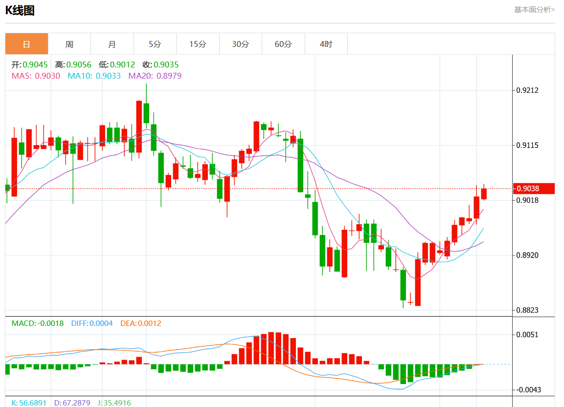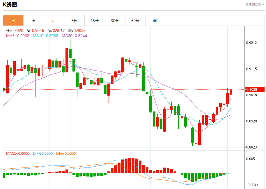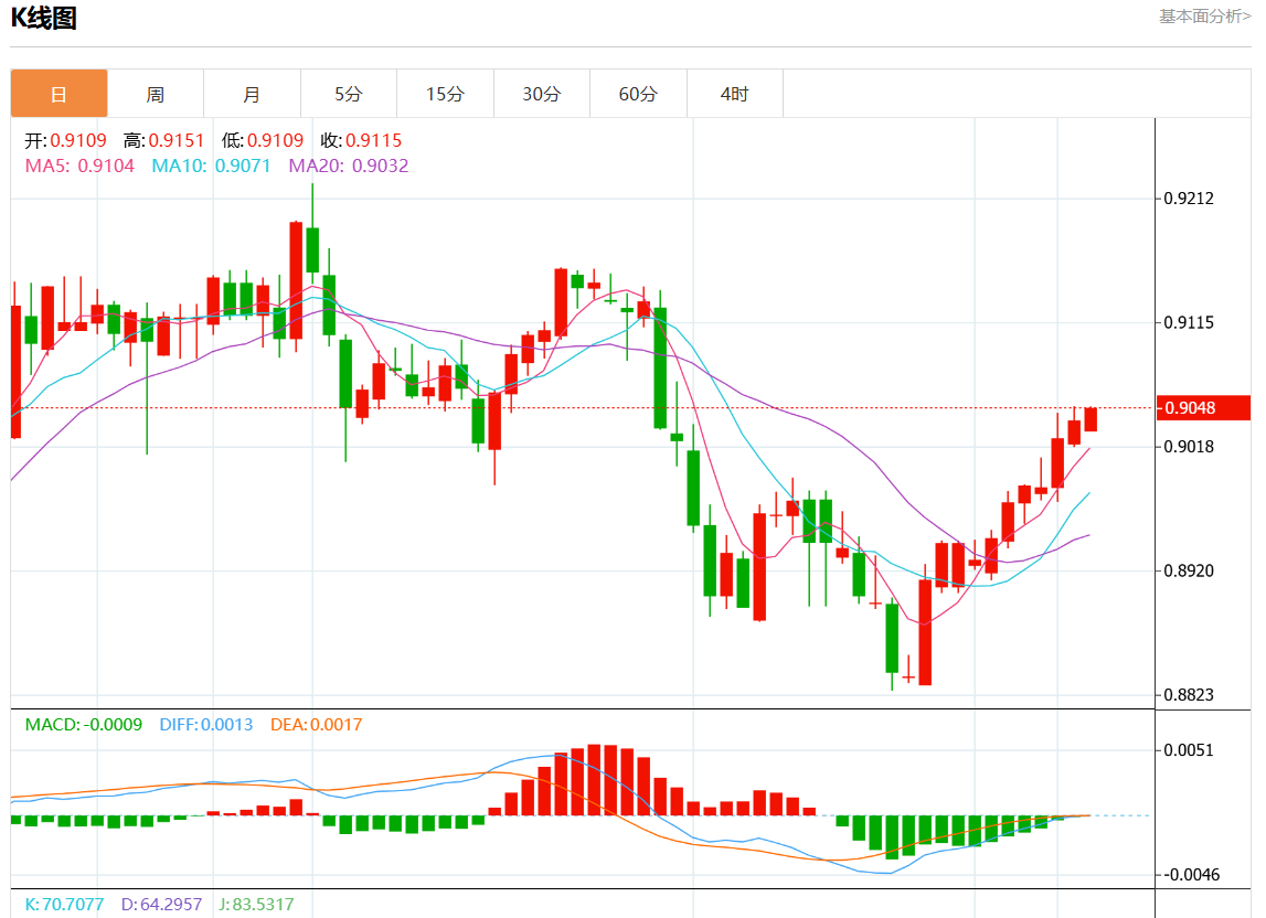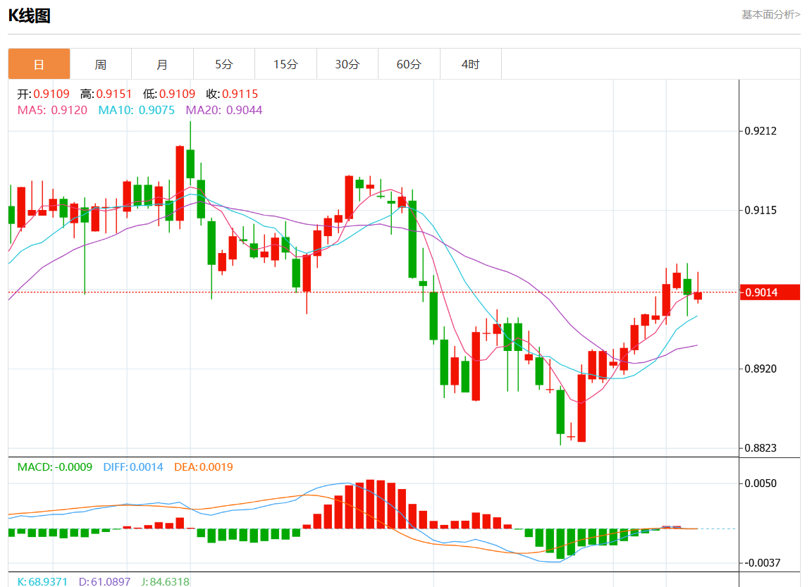 周二盘中,美元/瑞元报0.9036,涨幅0.15%. 今日分析:在0.9010之上,看涨,目标价位为0.9060,然后为0.9080。 技术点评:RI技术指标运行趋势复杂,倾向于上升。 支撑位:0.91000.90800.9060 阻力位:0.90100.89900.8975 (亚汇网编辑:静香)
