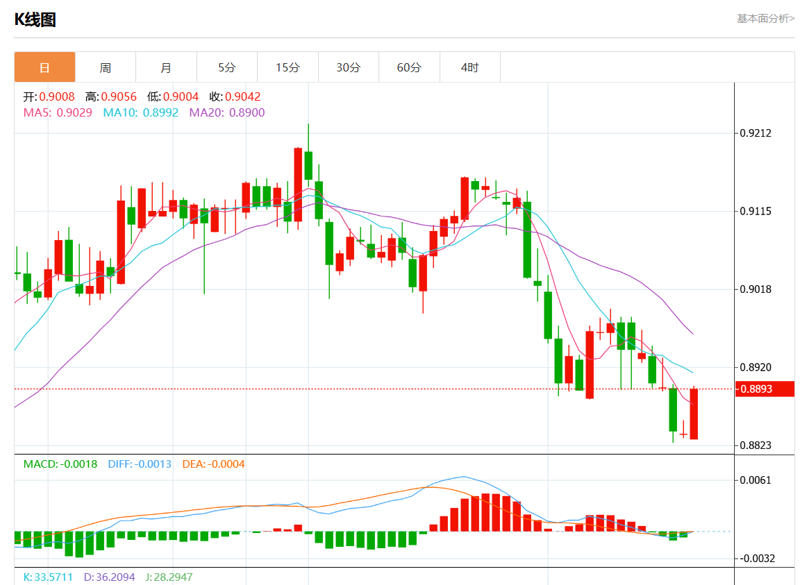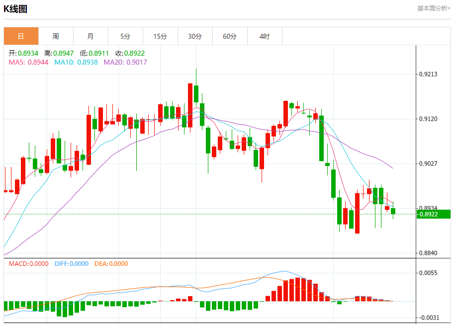 周二纽盘,瑞郎兑美元交投于0.8877,跌幅为0.22%。 瑞郎基本面分析 分析师VailiKaraani表示,如果瑞士央行在周四的政策会议上降息,那么瑞郎兑欧元可能回吐近期涨幅。货币市场预测瑞士央行降息25基点的概率为三分之二,因此理论上欧元有反弹的空间。 瑞郎上涨的主要原因是法国政治风险引发避险需求