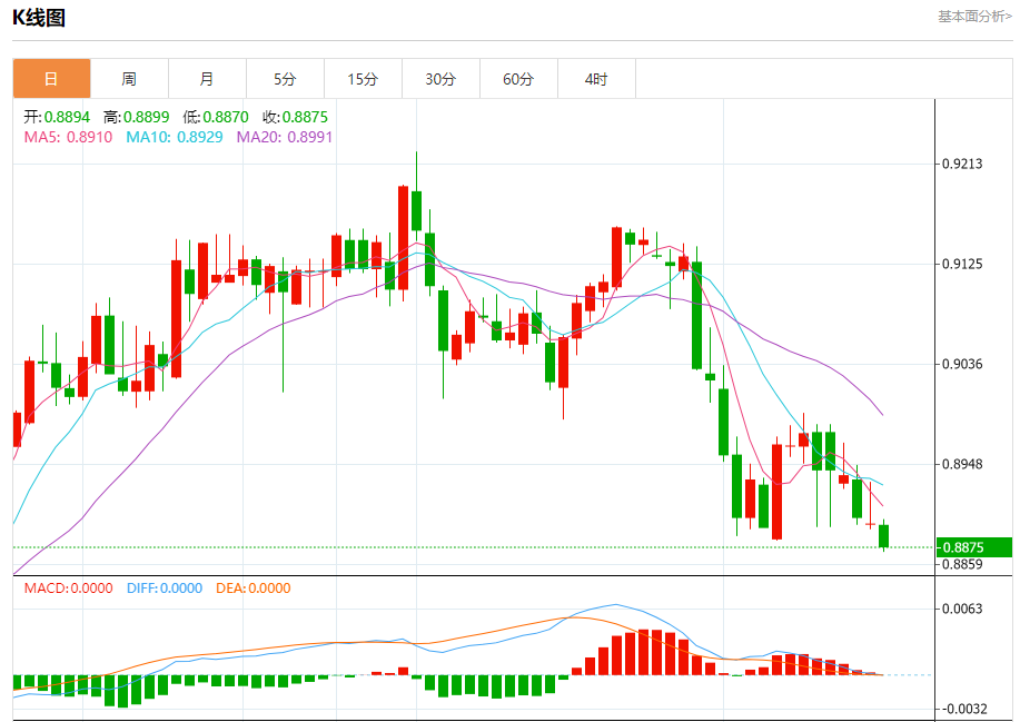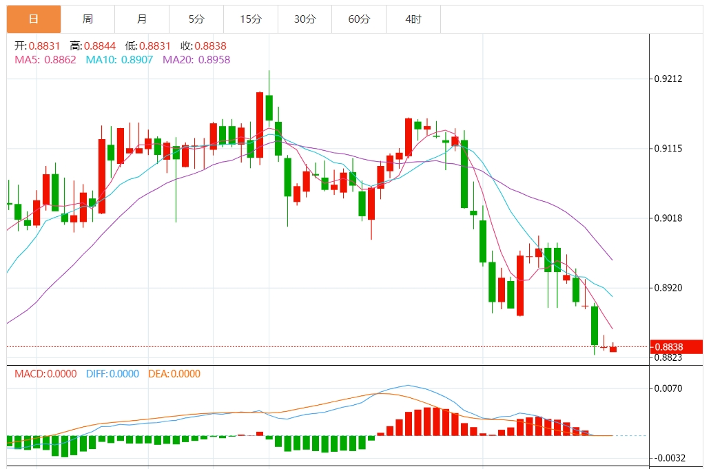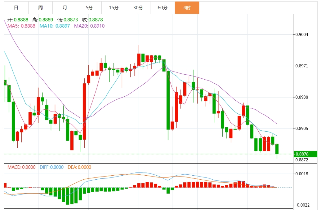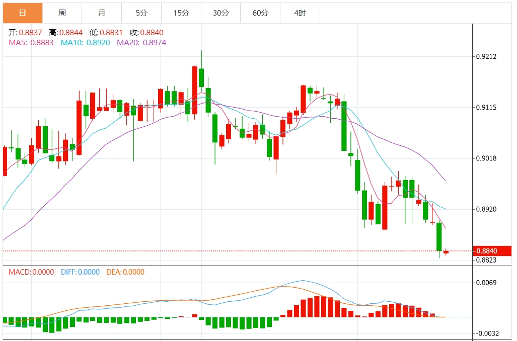 周四盘中,美元/瑞元报0.8885,涨幅0.54%. 今日分析:在0.8855之下,看跌,目标价位为0.8825,然后为0.8810。 技术点评:只要依旧存在0.8855阻力位,价格波动存在看跌的趋势。 支撑位:0.88900.88700.8855 阻力位:0.88250.88100.8795 (亚汇网编辑:静香)