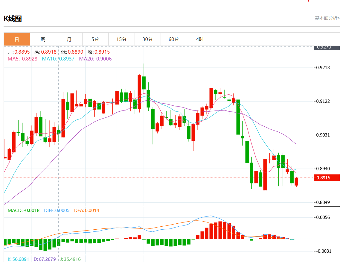 周三盘中,美元/瑞元报0.8833,跌幅0.03%. 今日分析:在0.8870之下,看跌,目标价位为0.8820,然后为0.8800。 技术点评:RI技术指标运行趋势复杂,倾向于下降。 支撑位:0.89100.88900.8870 阻力位:0.88200.88000.8780 (亚汇网编辑:静香)