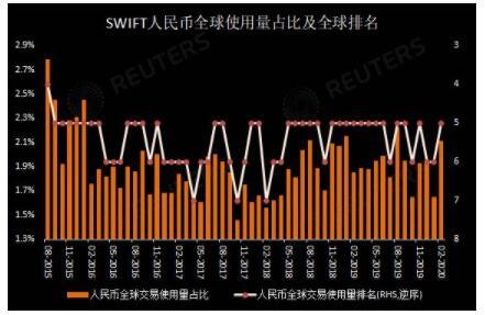 SWIFT提供新闻稿称,2月人民币支付价值相比1月上升了17.55%,同期全球支付价值则下降了8.09%;若排除欧元区内的国际支付排名,人民币2月仍在第八位,份额为1.41%,上月为1.11%。