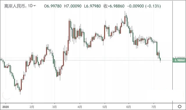 数据显示,7月9日早盘,离岸人民币继续拉升,截至下午三点,离岸人民币对美元汇率报6.9886元,最高涨至6.9798元。