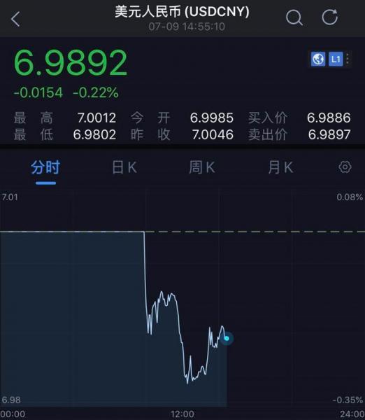 在中间价走高的提振下,7月9日,人民币对美元即期汇率开盘即升破“7”关口,报6.9985,随后进一步走高并升破6.99关口,最高至6.9802。