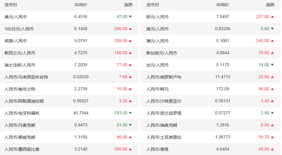 今日美元兑人民币报6.4516,下调(人民币升值)47点;上一交易日报6.4563;美元兑在岸人民币昨收6.4648元,美元兑离岸人民币昨收6.4667元