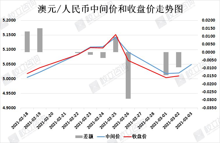 2021/3/3:澳元/人民币中间价报5.0486,中间价上调294点。中间价今日小幅上调,中间价今天调整幅度较小。上个交易日收盘价低于中间价,日内波幅较大。