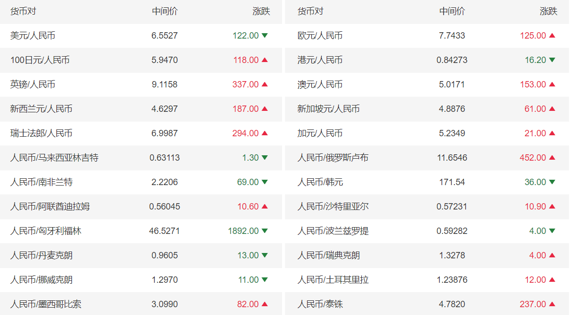 今日美元兑人民币报6.5527,下调(人民币升值)122点;上一交易日报6.5649;