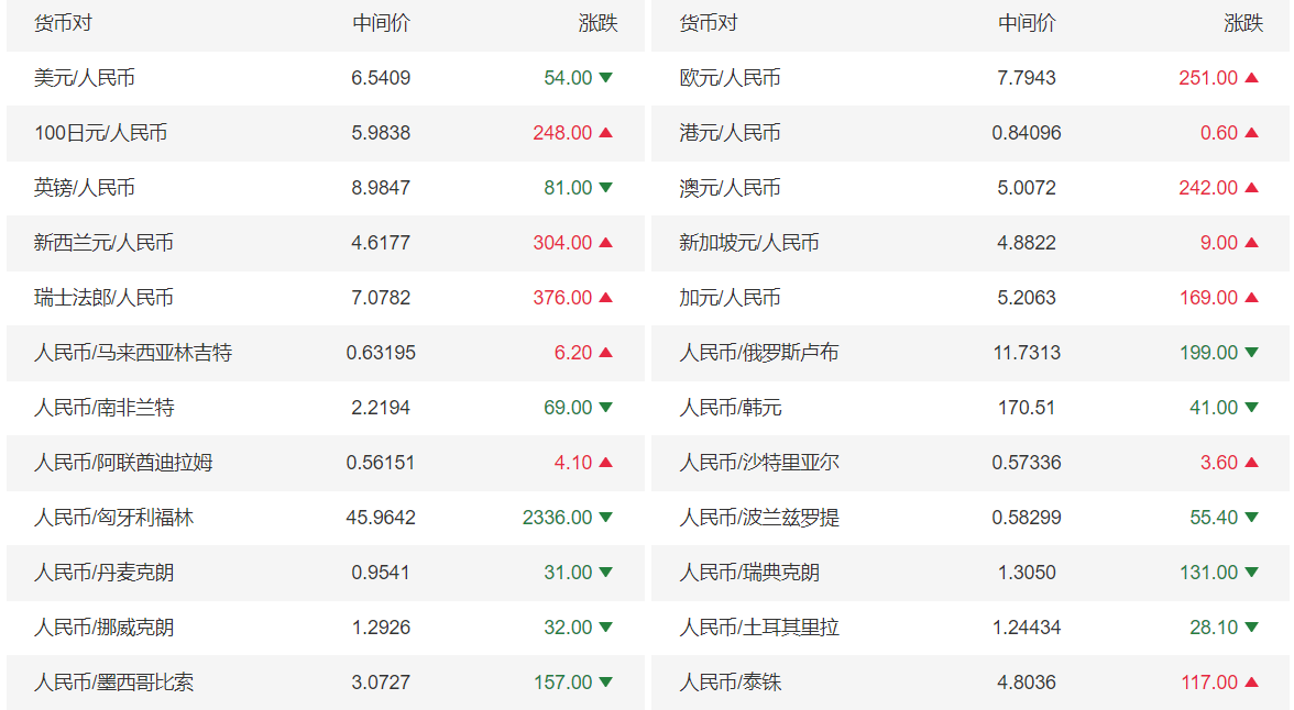 今日美元兑人民币报6.5409,下调(人民币升值)54点;上一交易日报6.5463;