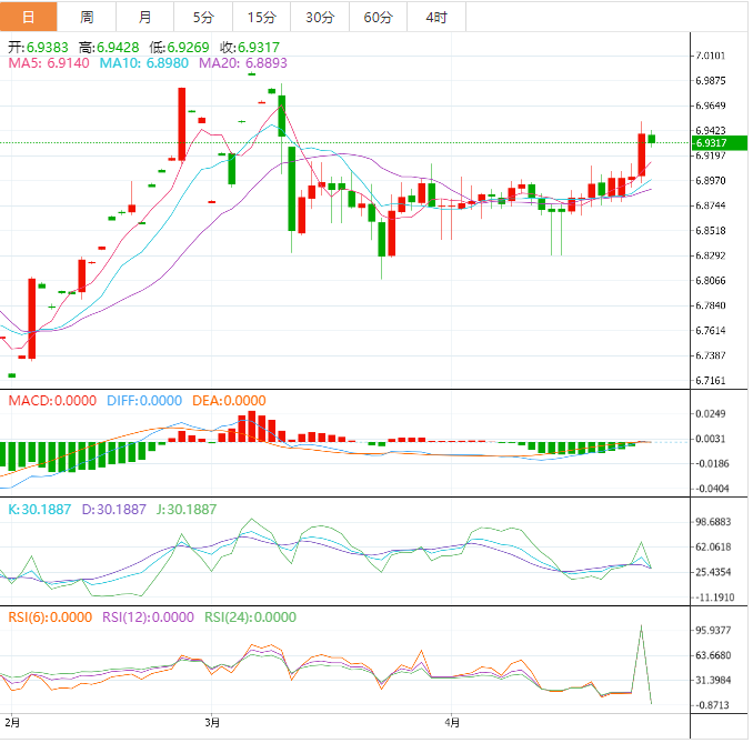 另一方面,如果日收盘价突破200日移动均线6.9520,可能会引导美元兑离岸人民币多头走向6.9840附近的三角顶线。
