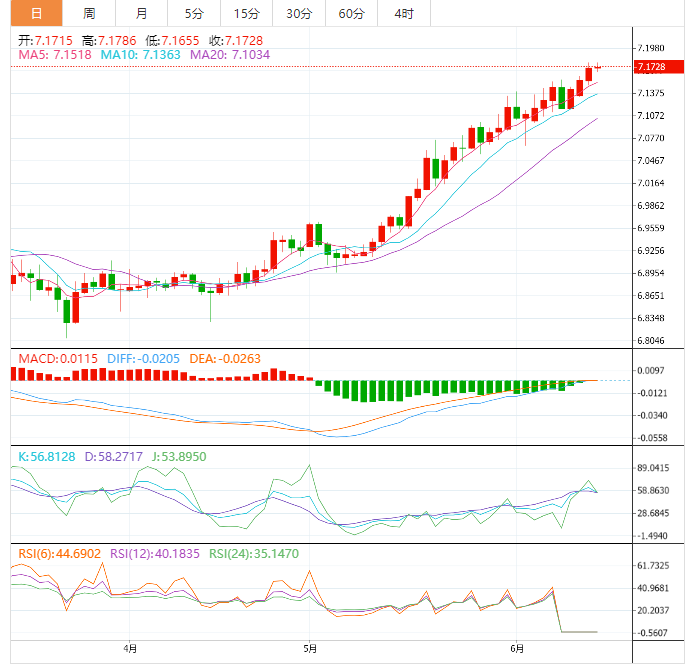 在此之后,7.2000的心理阻力可能会刺激买家,然后将他们引导到短期上涨通道的顶线,接近7.2020。