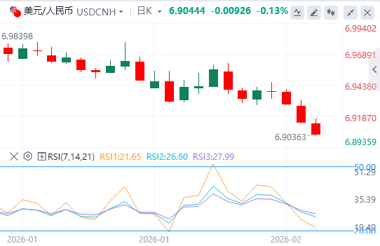 随着最新一波下跌,USD/CNH汇率确认了一条下降通道下限的新一轮突破。移动平均收敛背离(MACD)显示MACD线位于信号线下方接近零点,负直方图略有扩大,显示下行动能增强,验证美元兑CNH货币对的负面前景。