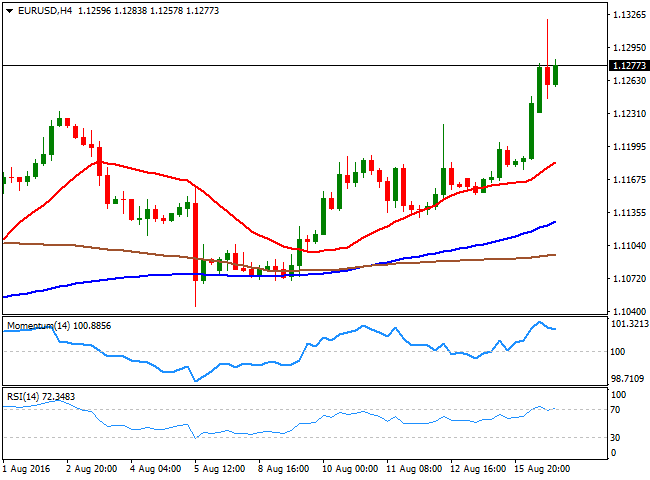4小时图上,RSI指标在一次有限的下行修正之后,于超买领域反弹。汇价远远位于20SMA上方,上升动力明显。只要欧元/美元处在1.1235上方,过去一周高位,风险依旧偏于上行,后期有望延续升势至1.1460,即长期静态阻力。