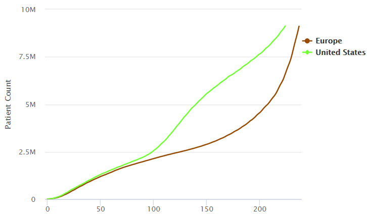 下图显示了美国(绿线)和欧洲(红线)新冠肺炎病例总数的增长情况,从中可以看出欧洲的增速更快