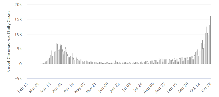 内尔还称:“比利时的医疗保健系统面临着极大的压力,周五可能会宣布进一步的限制措施。意大利和荷兰也可能采取进一步措施。令人感到欣慰的是,爱尔兰的感染病例似乎有所减少,该国一周前也实施了类似的局部封锁,关闭了非必要的零售和休闲/招待场所。”