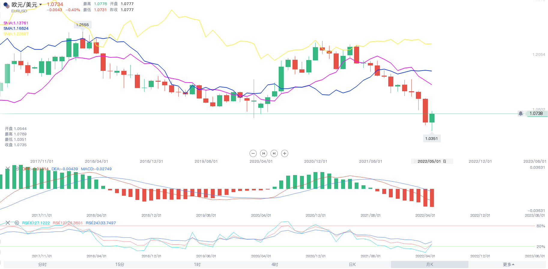 本月初,欧元/美元开盘1.0544,5月13日大幅下挫跌至五年低位,最低触及1.03501,主要受累于强势美元,欧洲经济放缓也拖累欧元,截至发稿,欧元/美元交投于1.0738附近