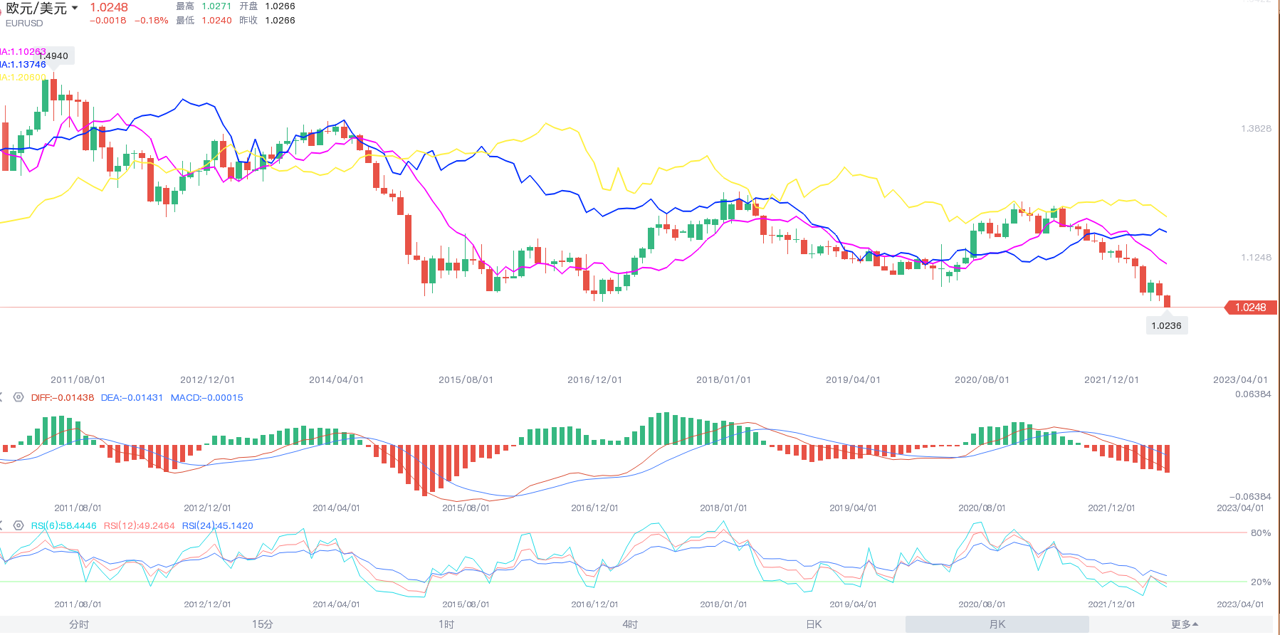 欧元/美元在2022年初在1.14附近短暂震荡之后便因美联储加息提前的预期而有所下行。2月下旬伴随7俄乌局势恶化,欧元跌破1.11附近关键支撑并下测1.08附近。进入4月以来,在美欧货币政策分化预期和俄乌局势反复所带来的避险情绪推动下,欧元继续走低并跌破1.08关键支撑。欧元的跌势持续到了5月上旬,最低点保持在1.0350附近。5月中下旬,在ECB官员们进一步释放鹰派信号以及市场对美联储加息预期维持稳定的背景下,货币政策分化逻辑有所转向,欧元也出现触底反弹迹象,一度站上了1.07。6月欧元/美元整体走低,跌逾2%,6月收报1.0481。
