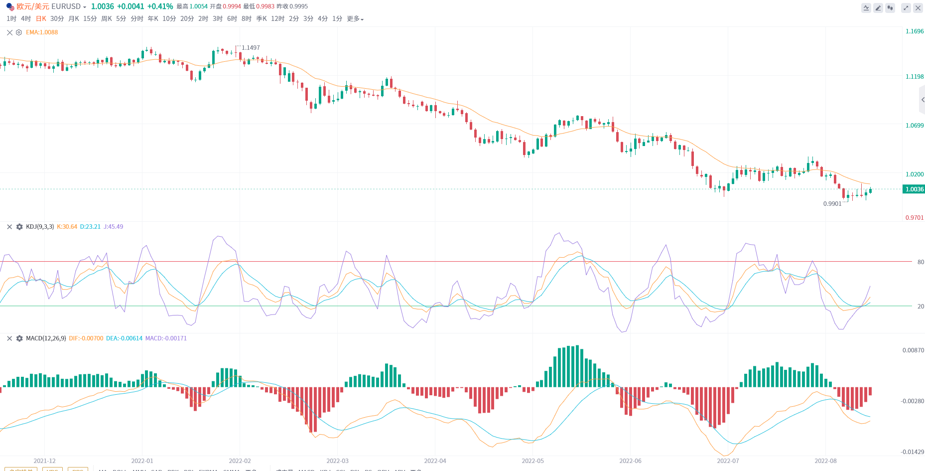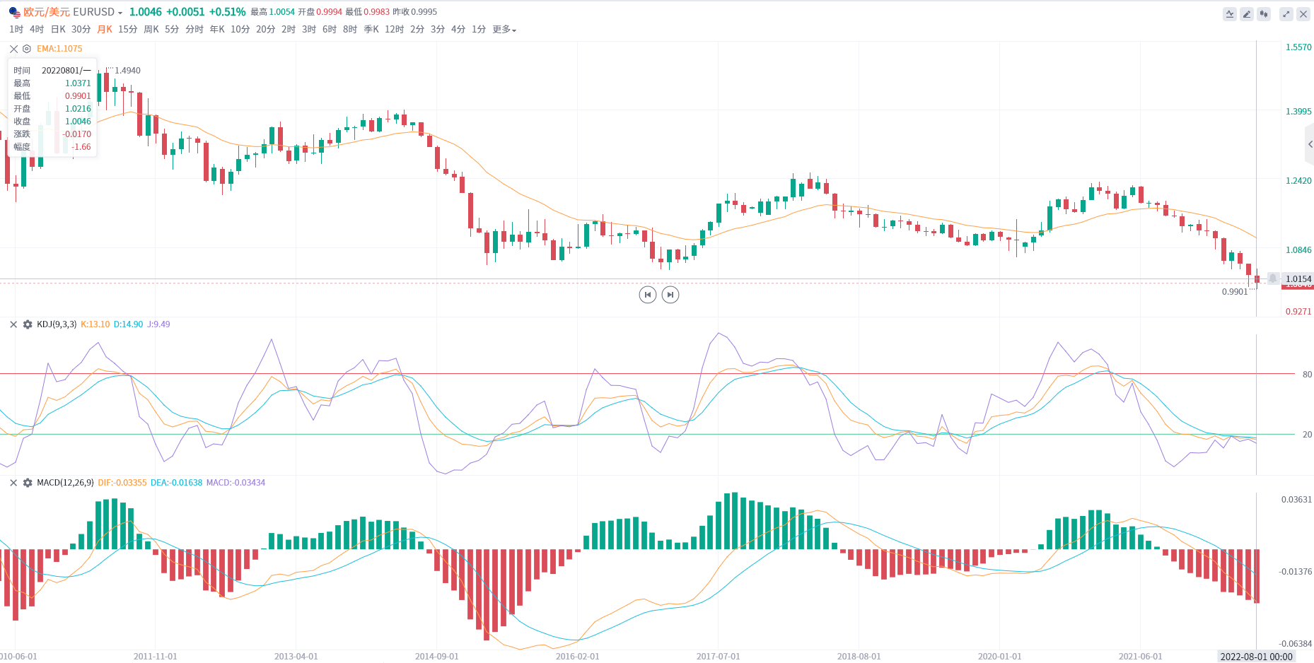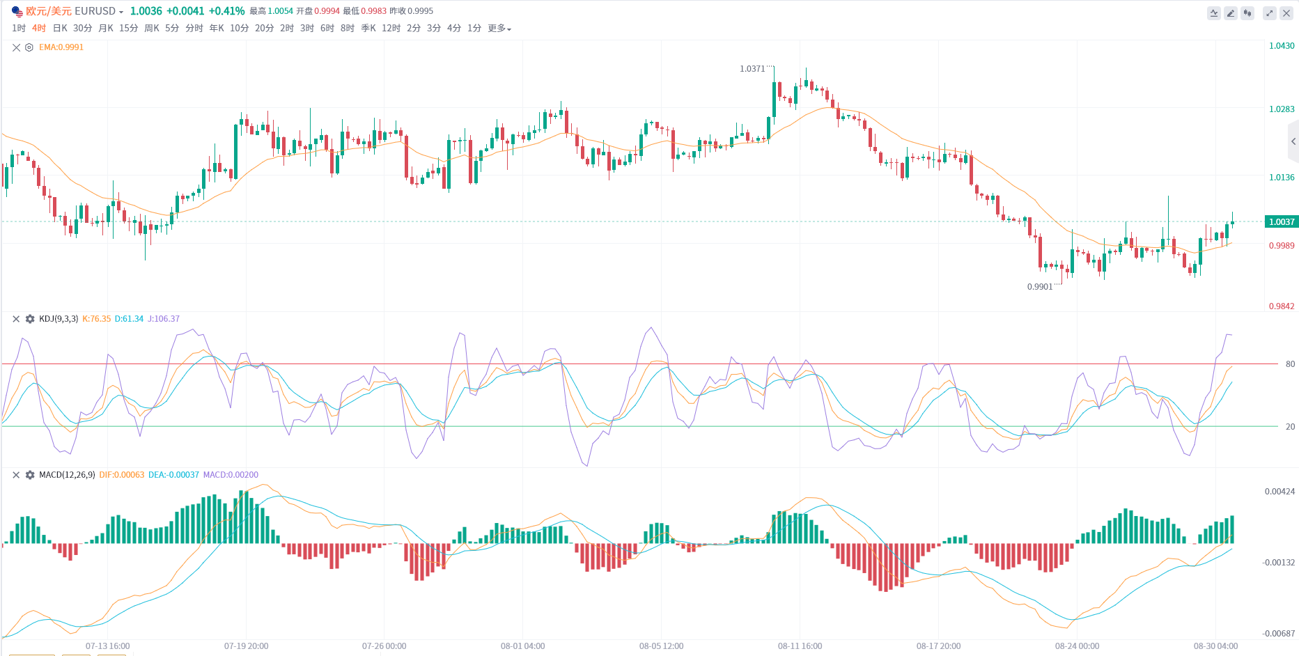 欧元8月开盘开盘1.0216最高1.0371 最低0.9901,截至目前,报价1.0046,本月已下1.66.