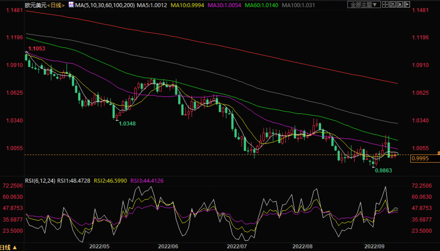如果欧元兑美元跌至0.9945以下,不排除出现今年低点(目前在0.9860附近)的可能性。在这种情况下,2002年末0.9860附近的底部将会引起市场的注意。