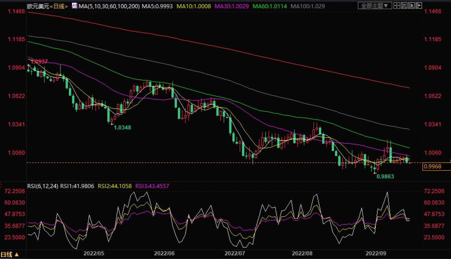如果欧元兑美元跌破0.9860仍然看跌,则不排除欧元逐渐跌向2002年9月接近0.9600的底部的可能性。