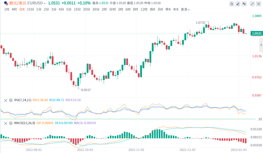 今天,美国还将公布的12月非农就业报告和ISM非制造业PMI,若数据依然强劲,料市场对鹰派美联储的预期将更盛。欧元兑美元的日线图显示,该货币对存在进一步下滑的风险,下破1.0450可能引发更进一步的抛售。4小时图也显示,欧美可能会延续跌势,目前20周期均线下穿100周期均线,下方正测试200周期均线,为11月初以来首次,动量指标与RSI也指向进一步看跌。