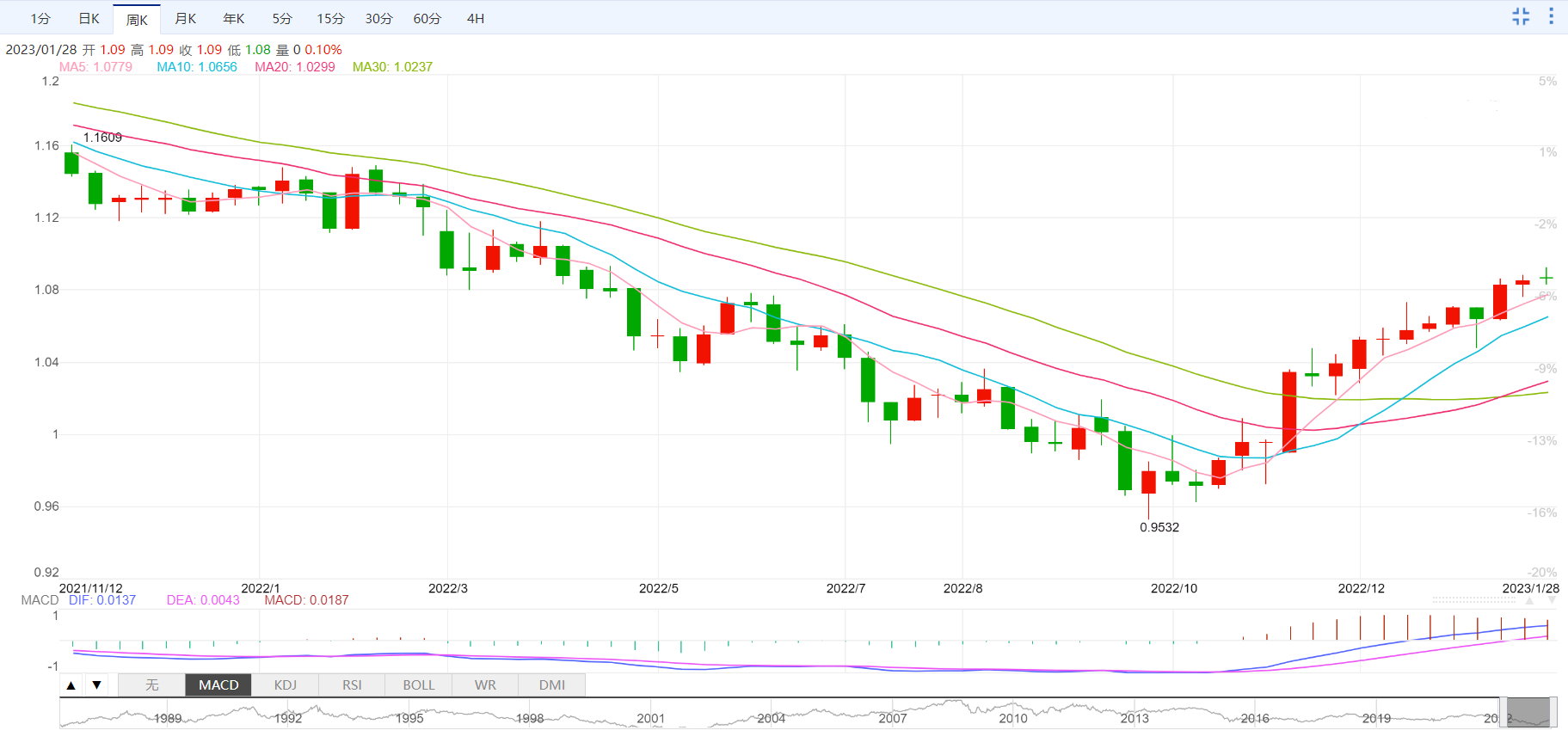 欧洲央行官员的鹰派言论让欧元兑美元获得动力,并触及1.0930附近的九个月最高水平。欧洲央行政策制定者克拉斯·诺特(Klaas Knot)和彼得·卡兹米尔(Peter Kazimir)都表示,他们赞成在2月和3月再加息两次50个基点。与此同时,欧洲央行行长拉加德周一在德国的一次会议上重申:“我们已经明确表示,欧洲央行利率仍必须以稳定的速度大幅上升,才能达到足够严格的水平,并在必要的时间内保持在这一水平。”
