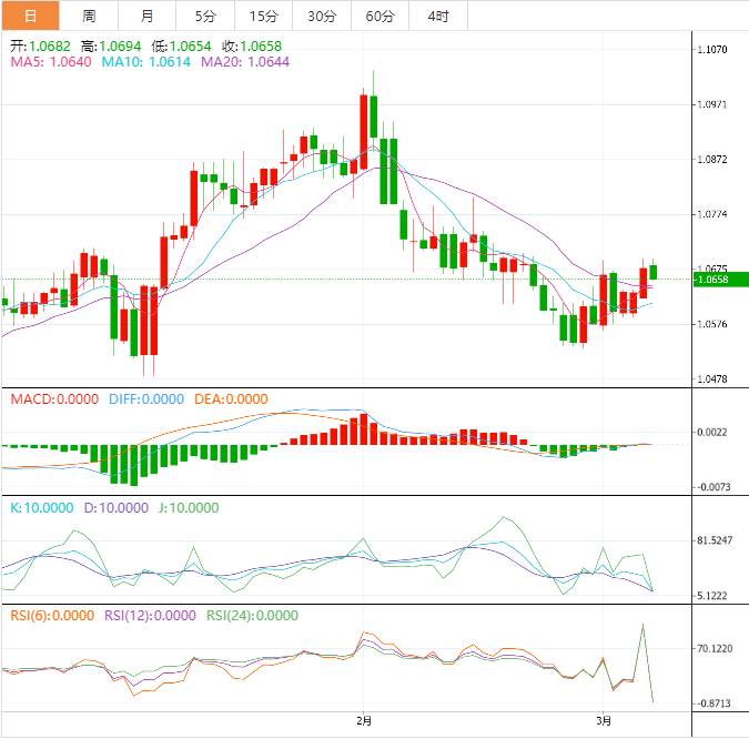 到目前为止,欧元兑美元回落了0.15%,至1.0657,并面临下一个支撑位1.0532(2月27日的月度最低价),随后是1.0481(1月6日的2023年最低价),最后是1.0326(200日移动均线)。