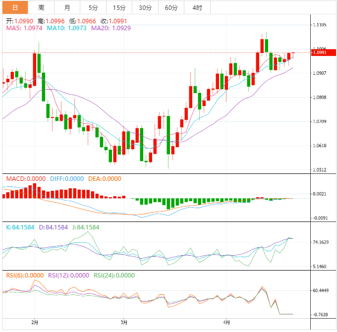 到目前为止,欧元兑美元已下跌0.05%至1.0982,并面临下一个支撑位1.0831(4月10日的月低点),其次是1.0788(4月3日的月低点),最后是1.0765(55日移动均线)。
