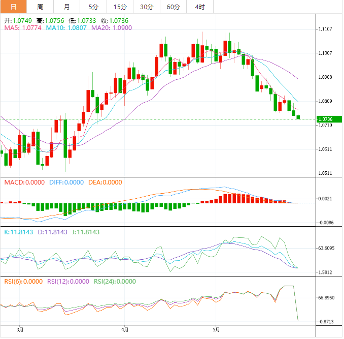 欧元兑美元在四小时范围内已经接近61.8%的斐波那契回撤位(从3月15日的低点1.0516到4月26日的高点1.1095)和1.0738。20期指数移动平均线(EMA) 1.0780对欧元多头来说是一个强大的障碍。