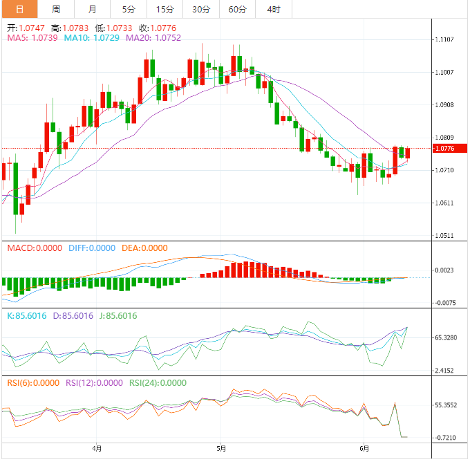到目前为止,欧元兑美元已经上涨了0.26%,达到1.0776,而突破1.0787(6月8日的月高点)将是1.0805(100日移动均线)的目标,并将一路到达1.0879(55日移动均线)。