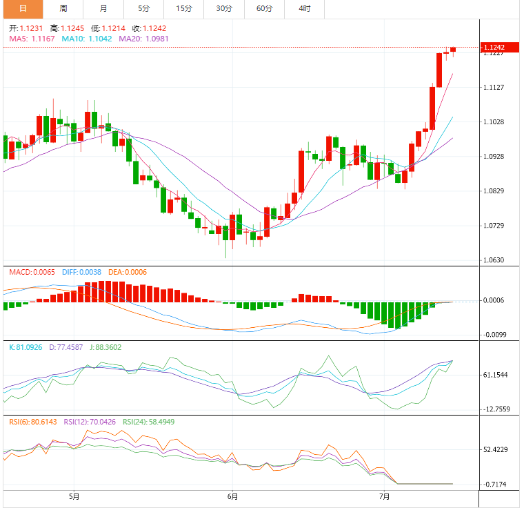 欧元技术面:欧元兑美元汇价在图表上显示出横盘走势,目前被限制在窄幅范围内,注意到随机指标清楚地摆脱了消极因素,等待得到积极的动机,这有助于推动价格恢复主要的看涨趋势,其下一个目标位于1.1275。