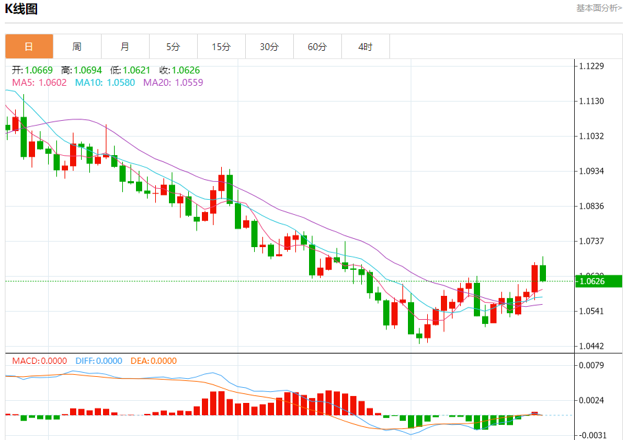周二欧市盘中,欧元兑美元交投于1.0630,跌幅为0.37%。